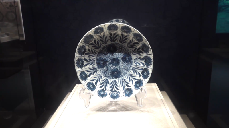 福州市博物馆讲解员张卓尔介绍了一件雏菊纹菱口盘。她说,“雏菊其实是意大利的一种花卉,是在19世纪由欧洲引入中国。但是在这件17世纪的青花瓷器上就可以见到雏菊纹这样的形制,验证了海上丝绸之路的交流和沟通。”