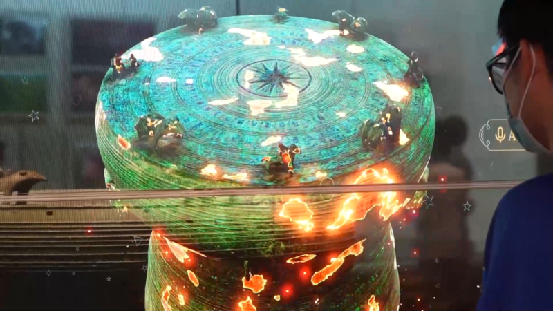 广西民族博物馆信息技术部主任徐光霁介绍,“它展示的是我们馆的一面一级文物铜鼓,是三国的乘骑水鸟饰变形羽人纹铜鼓。在这个柜里面,我们不光可以展示这一面铜鼓的信息,并且可以拓展到整个铜鼓这一类文物。”